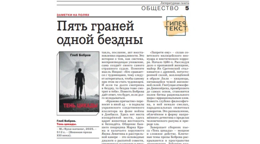 Вышедший недавно в московском издательстве «Яуза» сборник российского писателя, луганчанина Глеба Боброва «Тень цикады» — это не цикл и не дилогия. Это без малого десяток самостоятельных, на первый взгляд, ничем не связанных миров. Остановлюсь на четырех «несущих» повестях, составляющих становой хребет всего сборника, и одной прорывной пьесе автора, по которой и получил название.