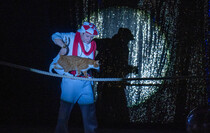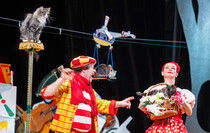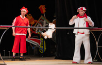 — Прежде всего, ежедневные тренировки. То что они так весело все делают, это заслуга постоянного ухода и постоянных занятий, а также разные залы, к которыс животные адаптируются. Мы к вам сегодня привезли полторы тонны декораций. Все, что вы видите на сцене — это все наше, начиная от одежды, заканчивая ковром.
