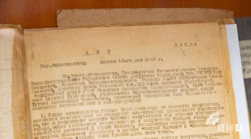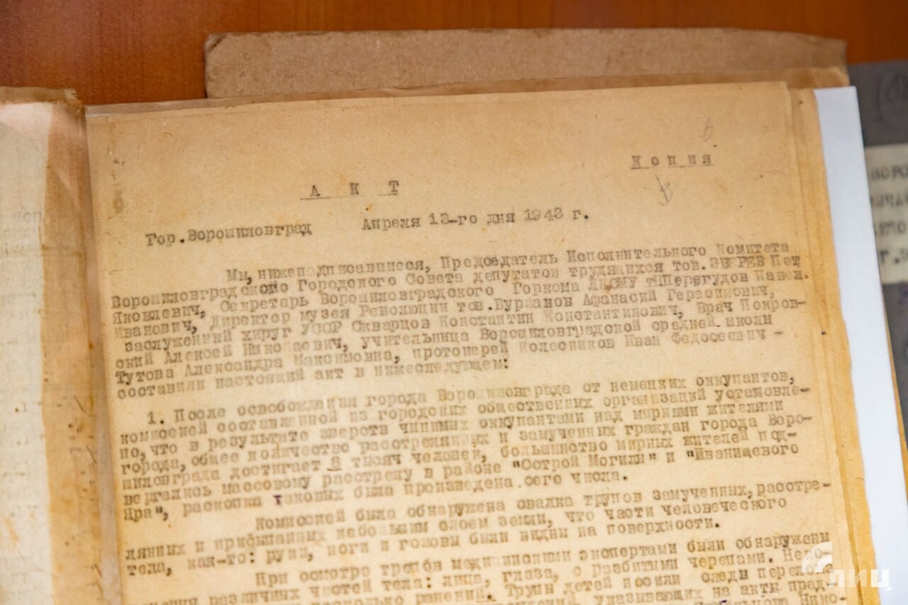 «Один из них рассказывает о подрыве завода имени 50-летия Октября накануне того, как в Ворошиловград вошли немцы. Этот акт интересен тем, что мы видим, что вся работа была настроена и на эвакуацию, и на то, чтобы немцам ничего не досталось. Также много документов, которые посвящены тяжелым событиям: вскрытию могил, массовых захоронений. Акт о вскрытии Острой Могилы у нас приведен, мы видим как выглядит подлинник», — рассказала Тодорова.