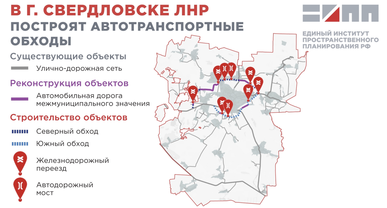 «Единый институт пространственного планирования РФ при разработке генерального плана Свердловского муниципального округа предложил построить Северный и Южный автотранспортные обходы Свердловска. Обе объездные трассы пройдут от пересечения с автомобильной дорогой регионального значения „Свердловск — Ровеньки“ до примыкания к автомобильной дороге регионального значения „Свердловск — Червонопартизанск“», — рассказали в институте.