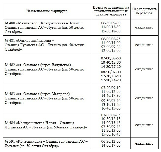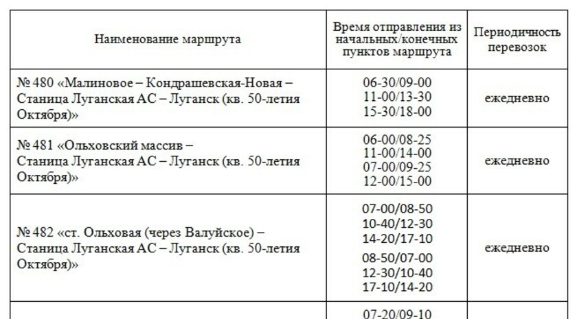 "В связи с поступающими обращениями публикуем расписание движения автобусов на пригородных маршрутах Станично-Луганского направления. Указано время отправления из начальных/конечных пунктов маршрутов (в порядке их расположения в названиях маршрутов)", - говорится в сообщении.