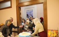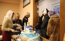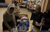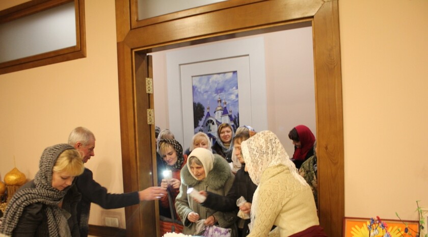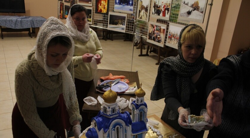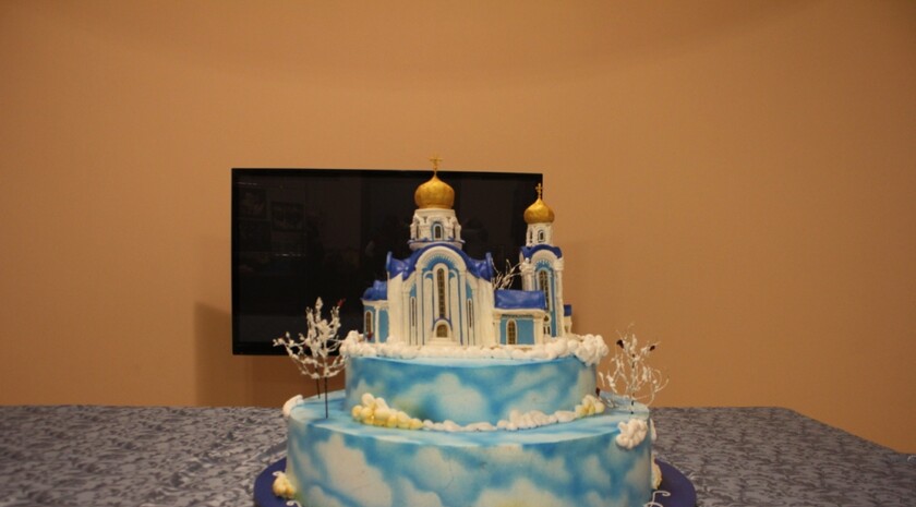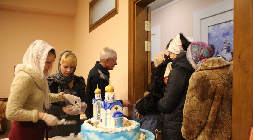 По окончании службы и торжественных речей клириков храма, прихожане ознакомились с выставкой православных луганских фотохудожников, а кондитеры столичного бюро нестандартных тортов Bisсuit room угостили всех присутствующих на литургии, начиная с детей, своим новым кондитерским произведением – 50-килограммовым тортом с искусно сооруженной на нем из кондитерской мастики копией храма "Умиление".