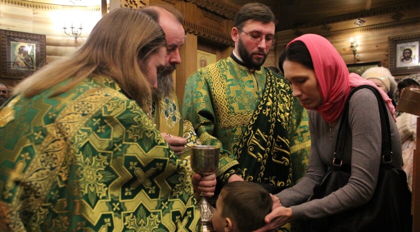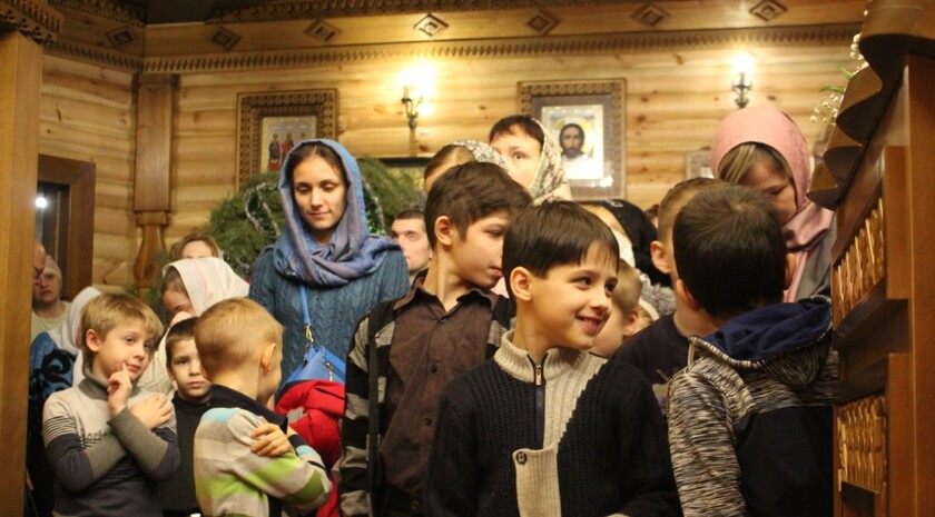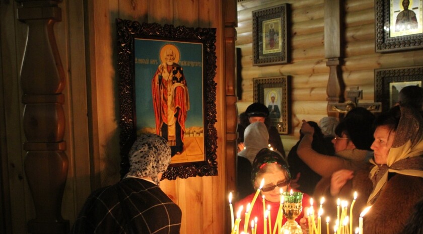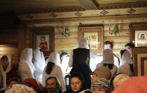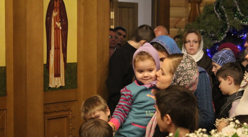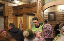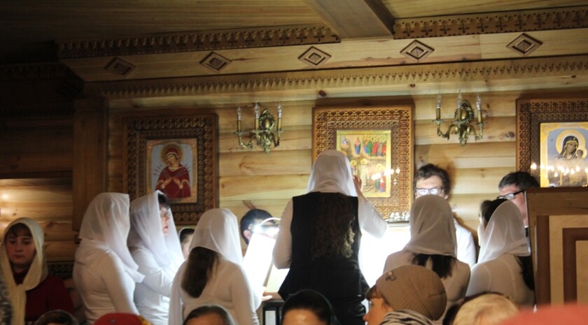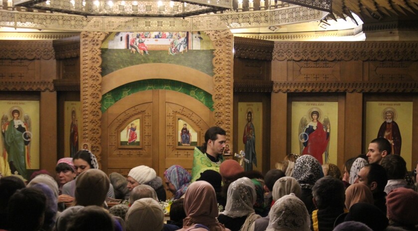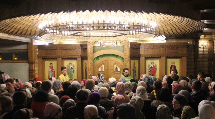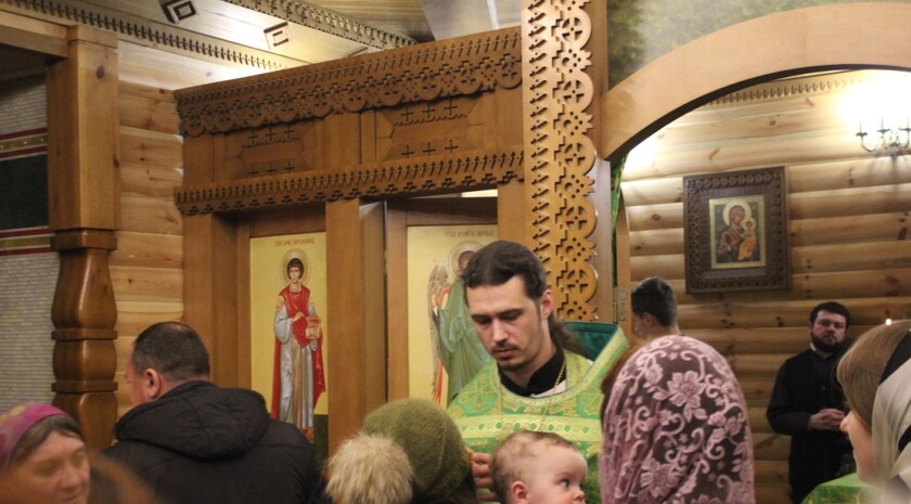 Маленький храм, который первоначально строился для совершения таинства крещения, не смог вместить всех желающих участвовать в службе, части верующих пришлось молиться в притворе церковного комплекса.