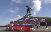 Затем активисты развернули у подножия памятника флаг РФ размером 15 кв. м.