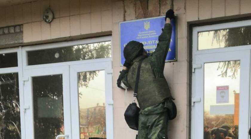 Военнослужащие Народной милиции ЛНР демонтировали государственные символы украинской власти на здании администрации поселка городского типа Станица Луганская. Об этом из населенного пункта передает главный редактор ЛуганскИнформЦентра Сергей Мешковой.