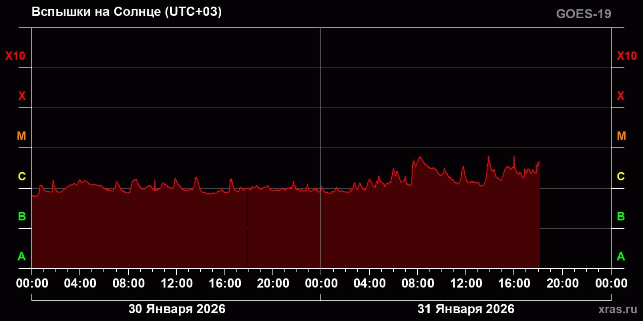 «На Солнце происходят довольно резкие изменения. На северо-восточном краю светила, где с утра ещё почти не было пятен, наблюдается стремительное формирование новой крупной активной области. Поток рентгеновского излучения от Солнца на этом фоне с утра вырос примерно на 500% и в настоящее время приблизился к порогу M-класса. До конца дня ожидается выход на уровень сильных вспышек, а если рост площади группы пятен продолжится с такой же скоростью, то в течение следующих 24 часов могут произойти первые вспышки уровня X», — цитирует агентство сообщение Института космических исследований Российской академии наук (ИКИ РАН).