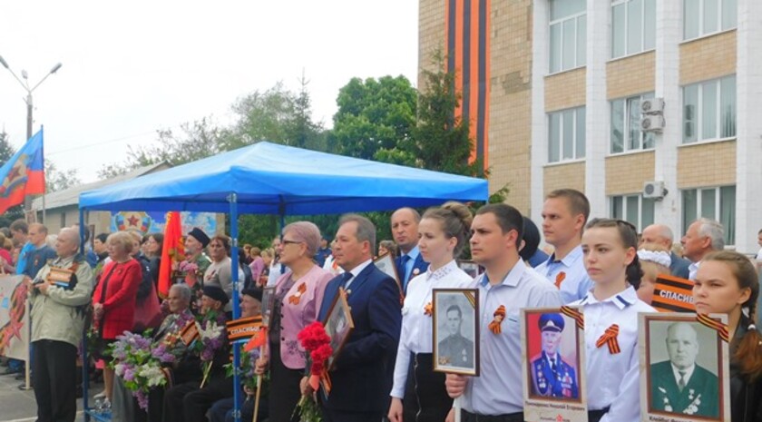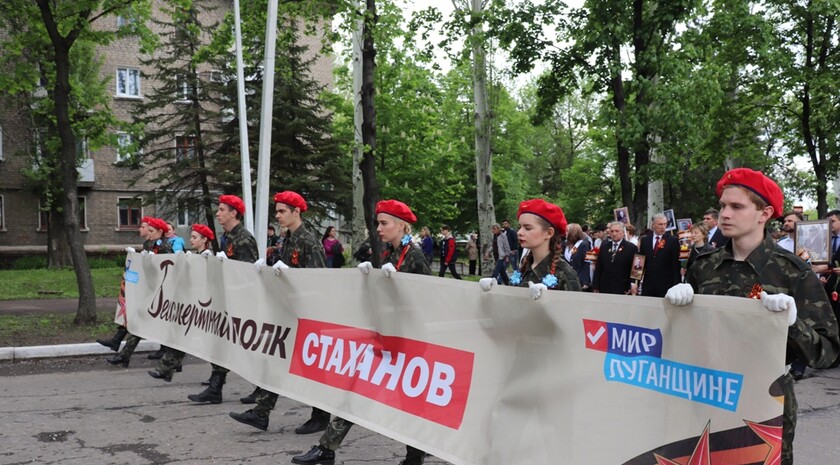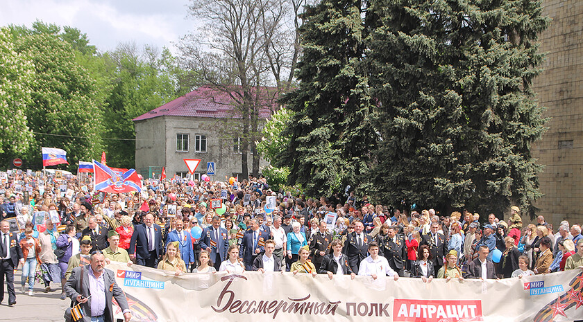 В День Победы тысячи стахановчан с портретами отцов, дедов и прадедов, бабушек и матерей, приближавших Победу в годы Великой Отечественной войны, а также погибших защитников Республики торжественно прошли по главной улице города в колонне "Бессмертного полка". Возглавил колонну празднично украшенный военный автомобиль, в котором проехал ветеран Великой Отечественной войны с маленькой девочкой на руках. За ним проследовали курсанты военно-патриотического клуба "Витязь", которые несли копию Знамени Победы.