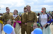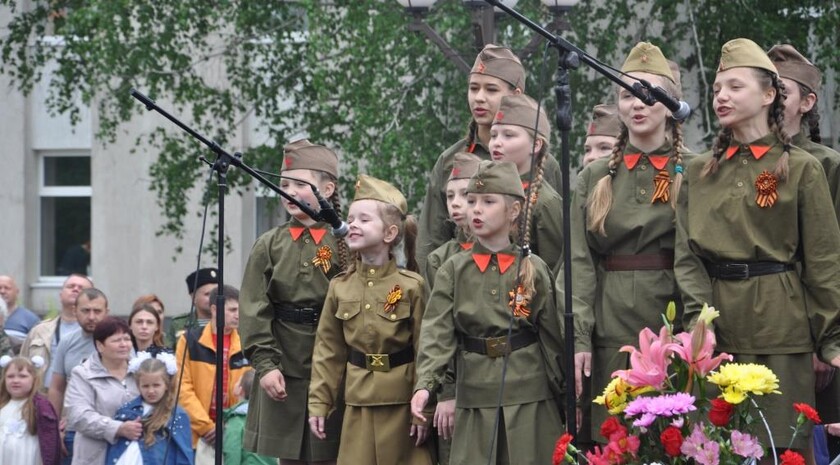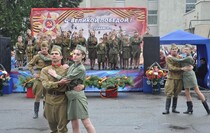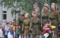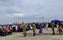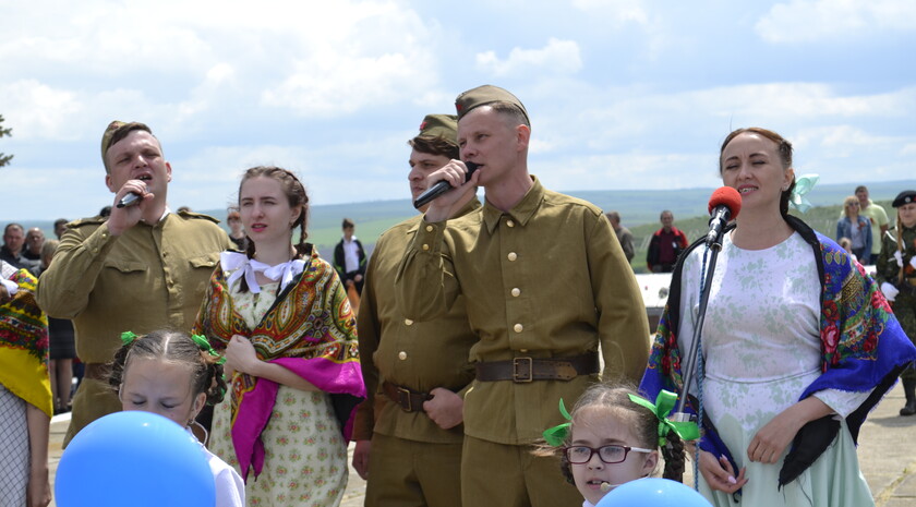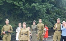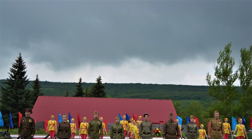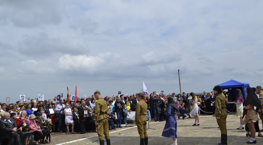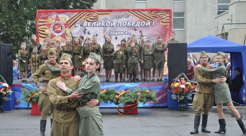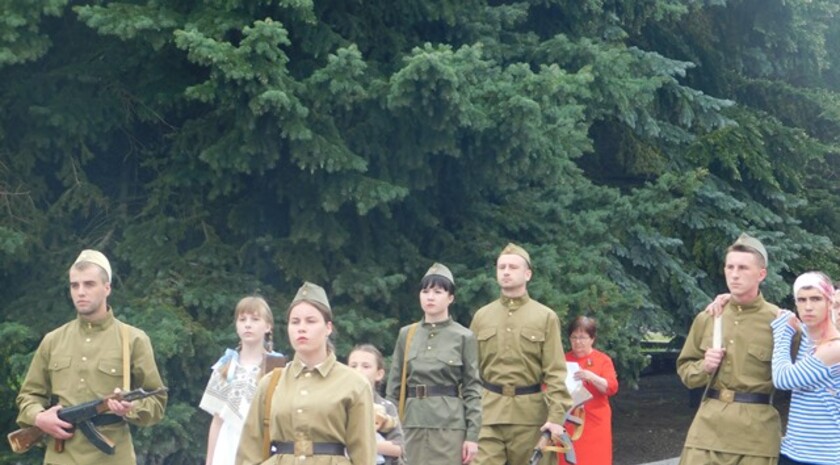 Затем на импровизированной сцене творческие коллективы районного Дома культуры показали театральную постановку на военную тему. Для ветеранов, почетных гостей и жителей города звучали песни военных лет.