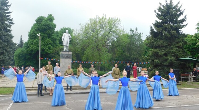 Затем на центральной площади Стаханова состоялся праздничный концерт "Песни – герои войны", подготовленный творческими коллективами городского Дворца культуры имени Максима Горького.