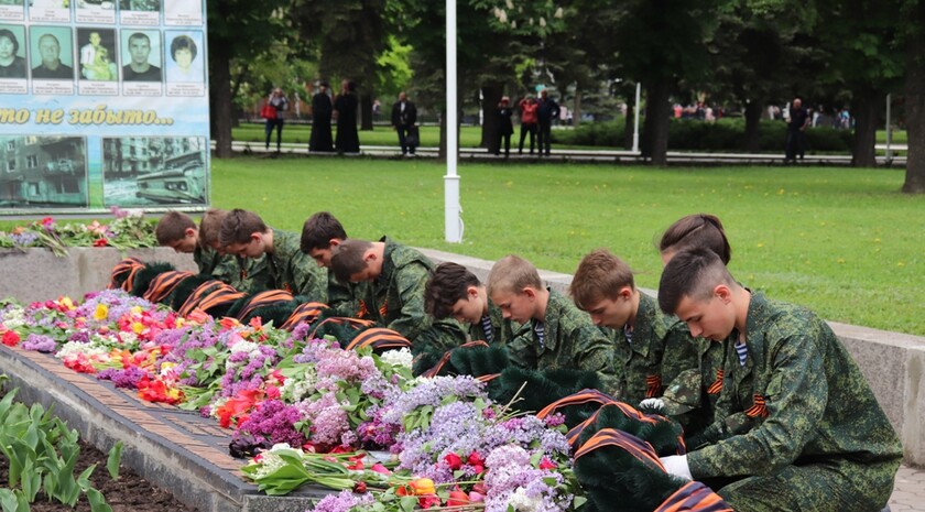 Юнармейцы и военнослужащие Народной милиции ЛНР возложили Гирлянду Славы к монументу воинам шахтерских дивизий. Возложили цветы и отдали дань уважения подвигу солдат Великой Отечественной руководители города, депутаты Народного Совета ЛНР, представители общественных организаций и казачества, ветераны локальных войн и благодарные жители города.