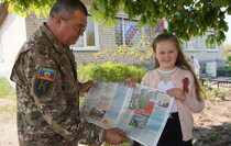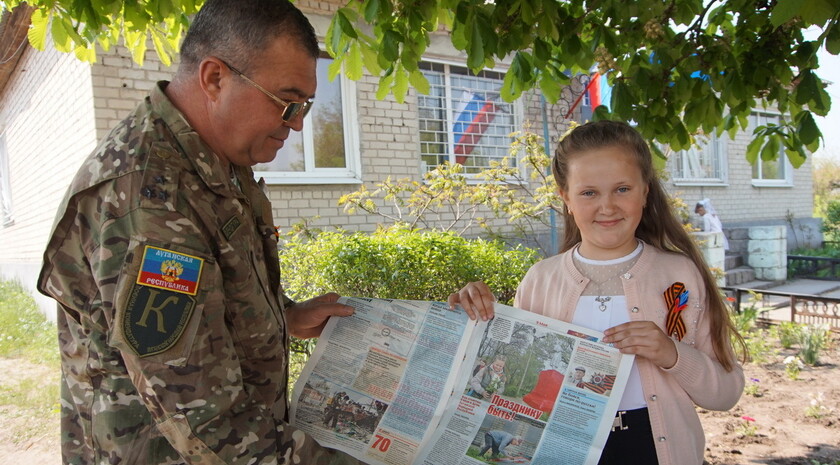 Кроме этого, Гизай и Грачев раздали жителям села праздничный спецвыпуск газеты "Комсомольская правда" георгиевские ленты.