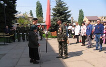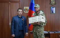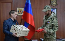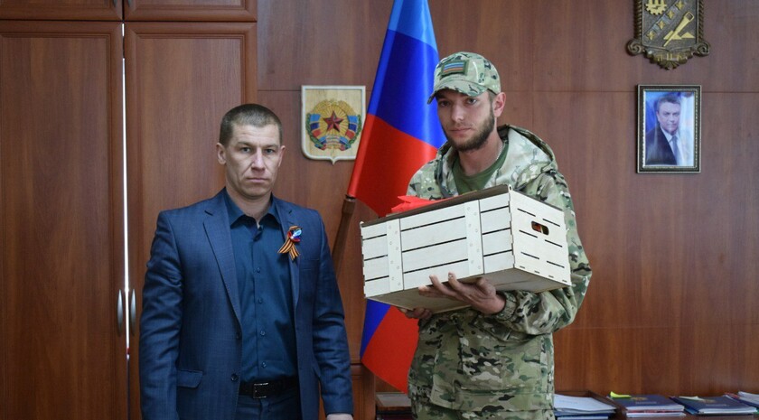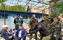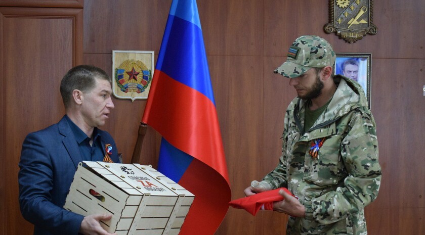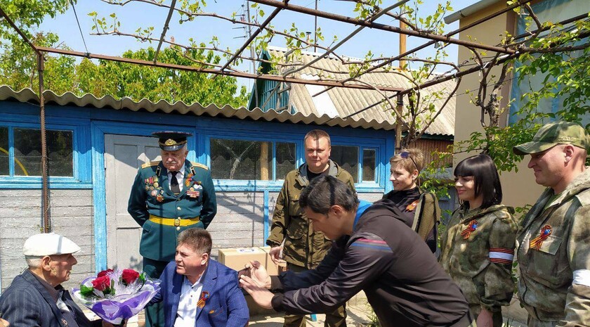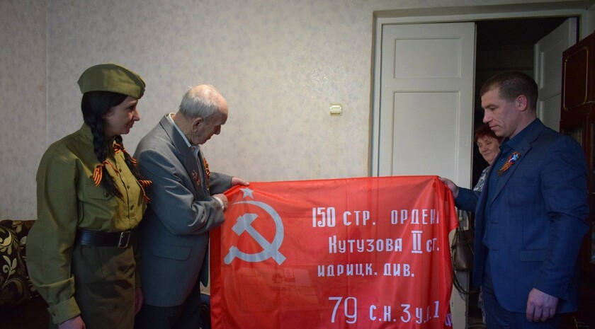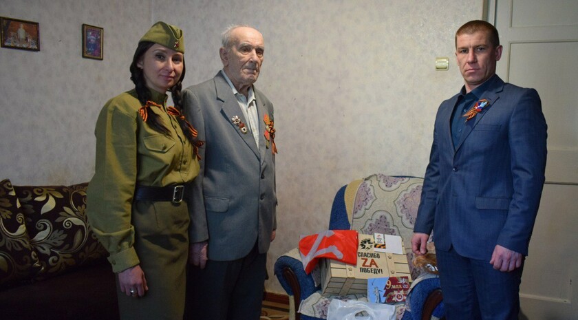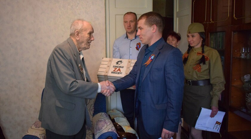 Глава администрации Первомайска Сергей Колягин вручил подарочные наборы и копии Знамени Победы ветерану Великой Отечественной войны Ивану Петрусенко, а также военнослужащему Народной милиции ЛНР Назару Левицкому, получившему ранение в ходе освобождения Донбасса.