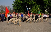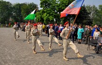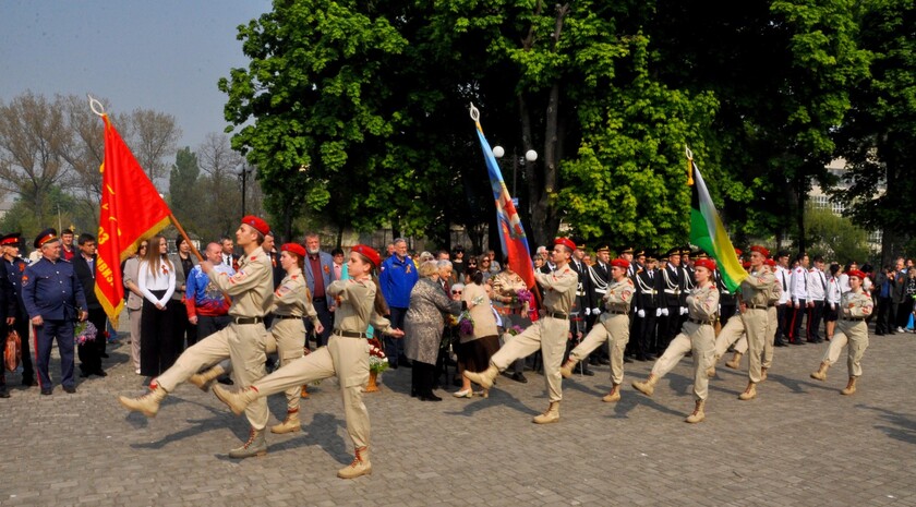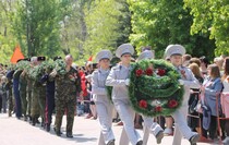Участники межведомственного проекта "Почетная республиканская Вахта Памяти "Пост № 1" Краснодона" провели марш-парад с копиями Знамени Победы, также на площади состоялся концерт "Аккорды победного мая".