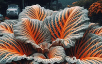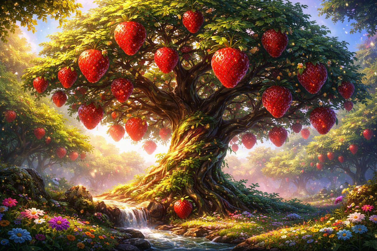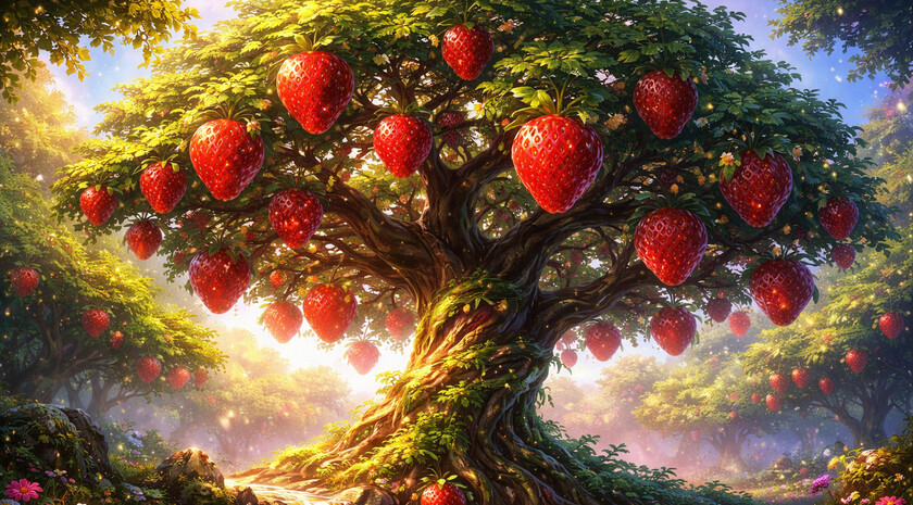 Среди них — деревья, на ветвях которых идеально ровные гроздья клубники и малины, плоды невероятных цветов и окрасок, фрукты невиданных размеров. На некоторых картинках клубника по размерам сопоставима с морковью или яблоками, а смородина — с бананом.