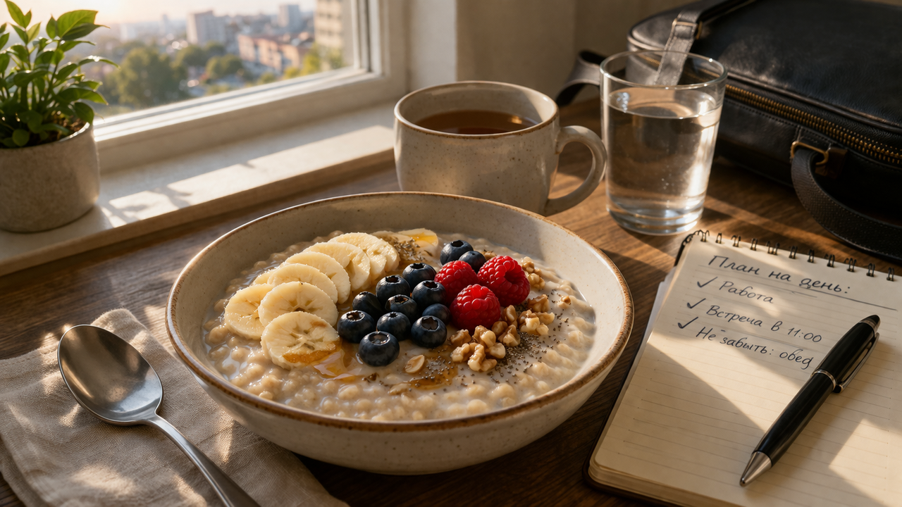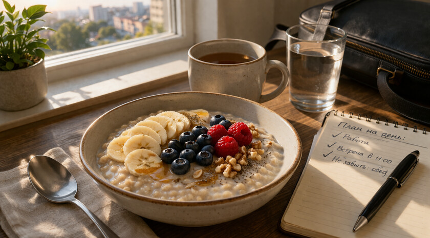 Вернитесь и добавьте наполнители (фрукты, ягоды, ложку меда) — каша готова. Если вы хотите белковый завтрак, добавьте в готовую кашу ложку творога или протеина — он растворится в теплой массе.