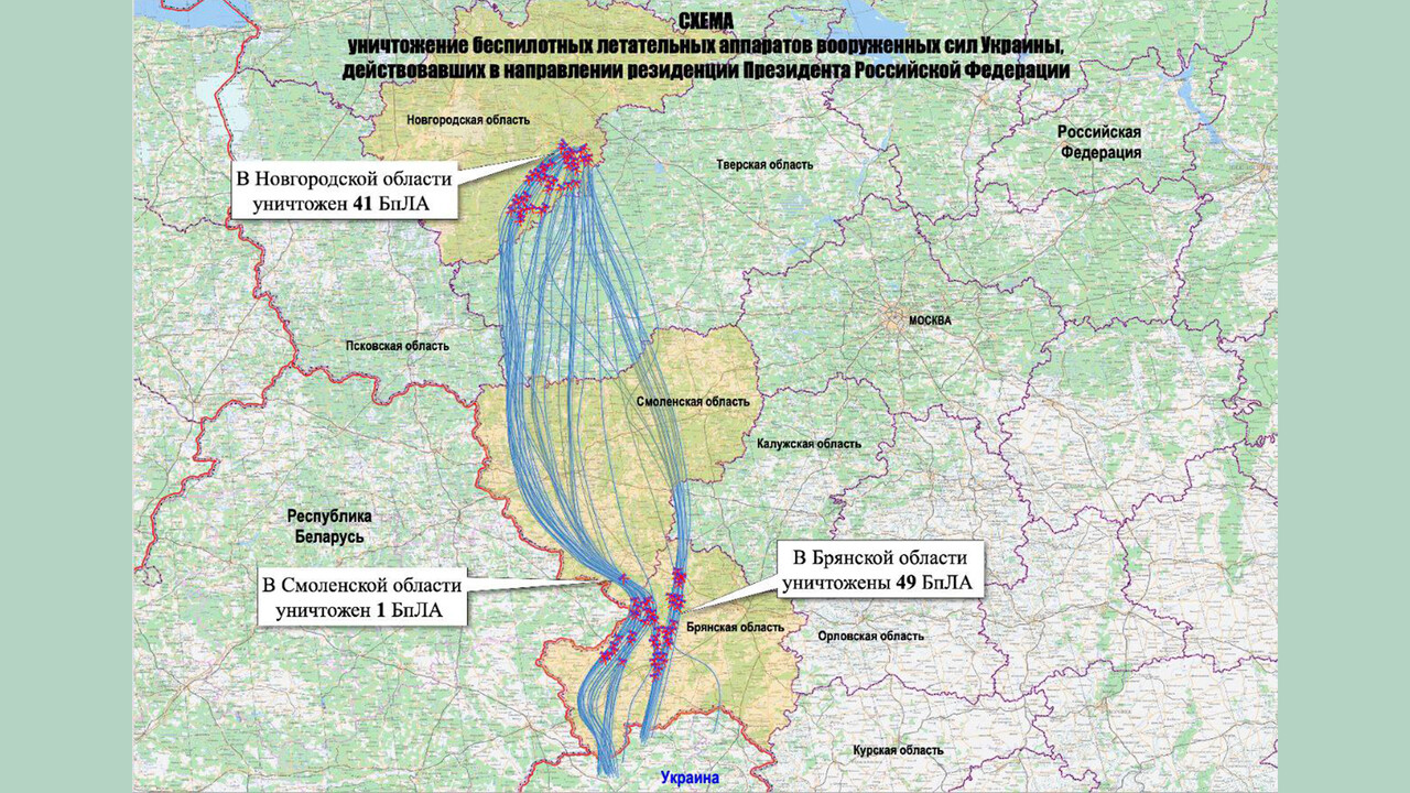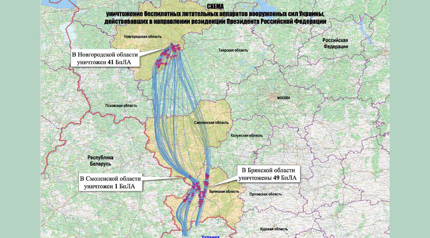 Он добавил, что нанесение удара осуществлялось по нескольким направлениям — над территориями Брянской, Смоленской, Тверской и Новгородской областей с применением 91 беспилотного летательного аппарата.