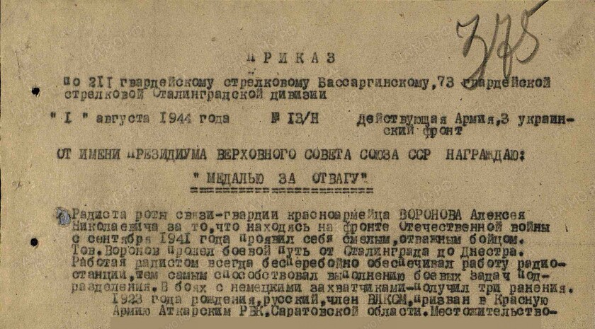 Выписка из приказа № 10/н от 14 февраля 1945 года по 211 гв. сп 73 гв. сд.: "Радист роты связи гвардии ефрейтор Воронов награжден медалью "За отвагу" за то, что он в боях по расширению плацдарма на берегу реки Дунай беспрерывно поддерживал связь батальона, находившегося в окружении, с КП полка, уничтожил одного солдата противника и вынес из окружения батальонную рацию".