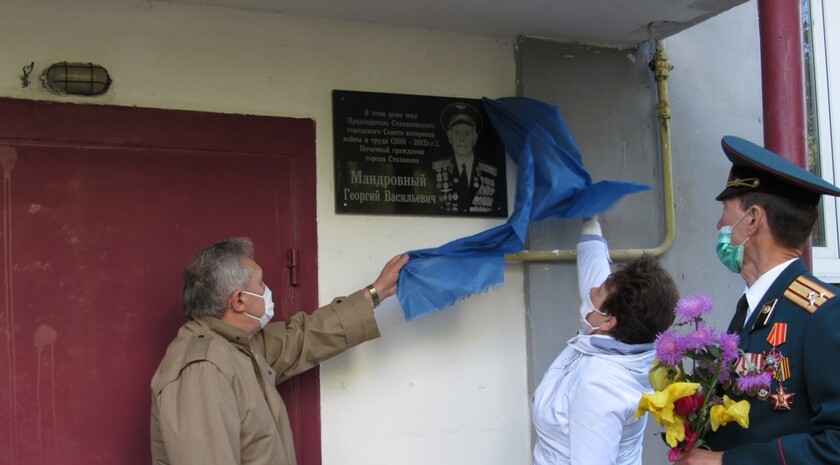 "В рамках года Памяти и Славы в Стаханове состоялось торжественное открытие мемориальной доски бывшему председателю городского совета ветеранов войны и труда, почетному гражданину города Георгию Васильевичу Мандровному. Памятную доску установили на стене дома № 21 по улице Богдана Хмельницкого, где ветеран прожил много лет", – говорится в сообщении.
